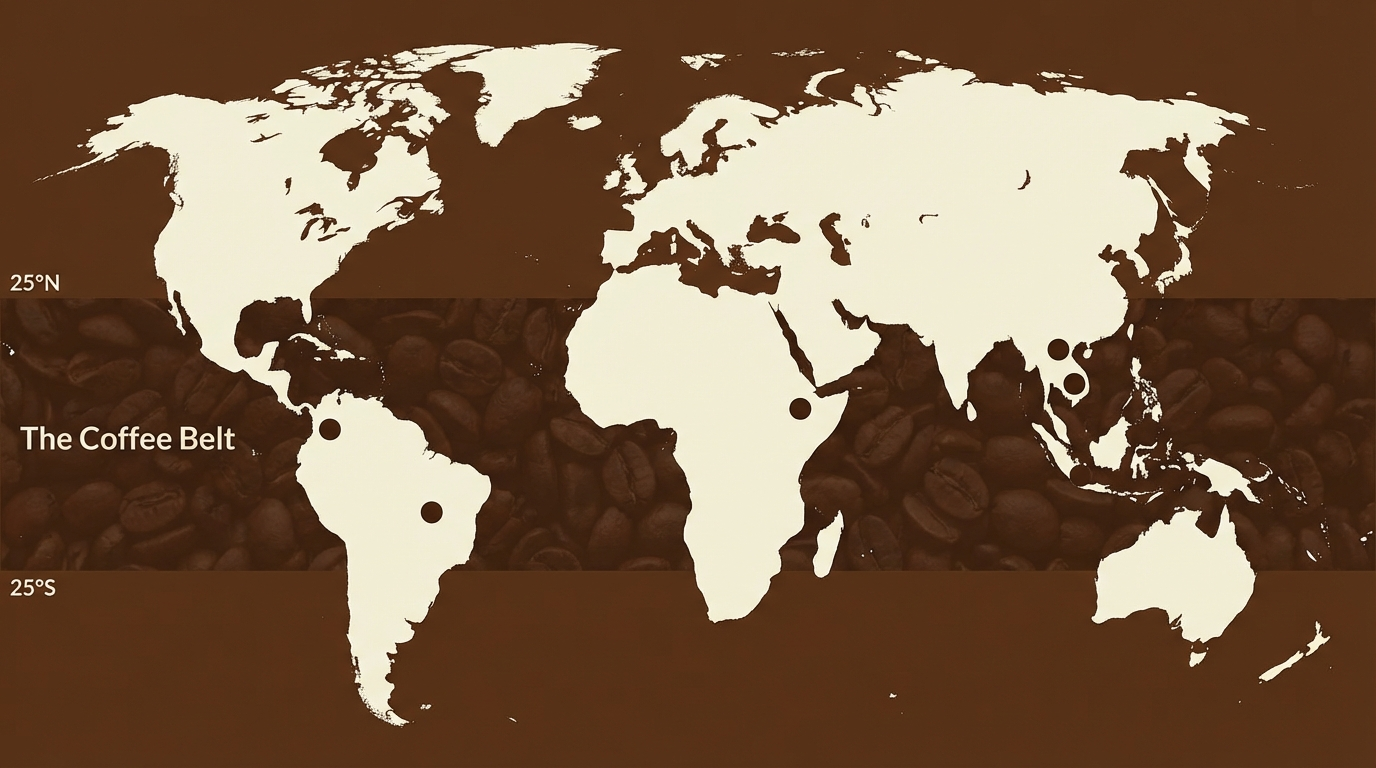 적도를 중심으로 남위 25도에서 북위 25도 사이. 북회귀선과 남회귀선 사이에 걸쳐진 이 열대·아열대 지역을 **커피벨트(Coffee Belt)**라고 부른다.