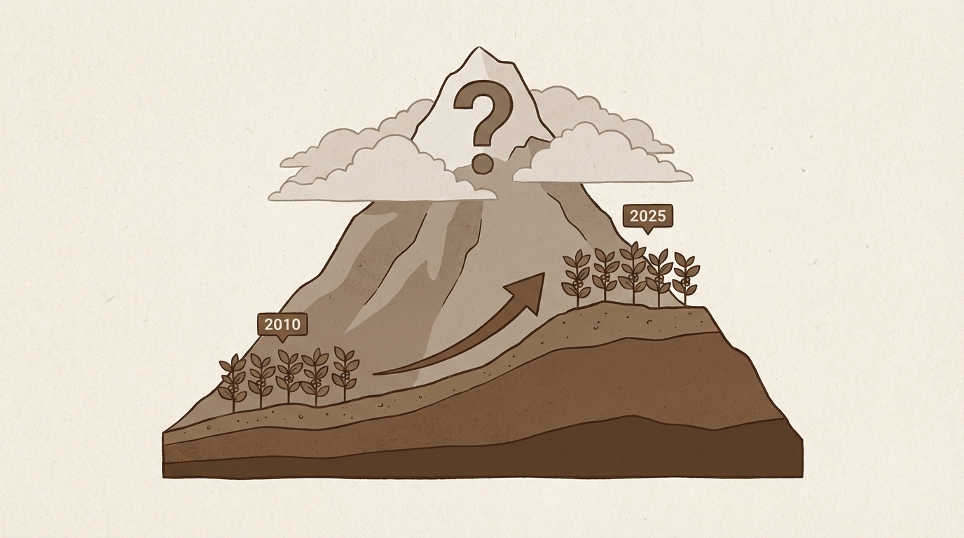 IPCC에 따르면 커피 재배 지역의 평균 기온은 2050년까지 1.5~2.5°C 상승할 전망이다. 1도만 올라가도 커피 체리의 숙성 속도가 빨라져 풍미가 단조로워지고, 3도 이상 올라가면 광합성 효율이 급감하며 열매 자체가 맺히지 않는다.